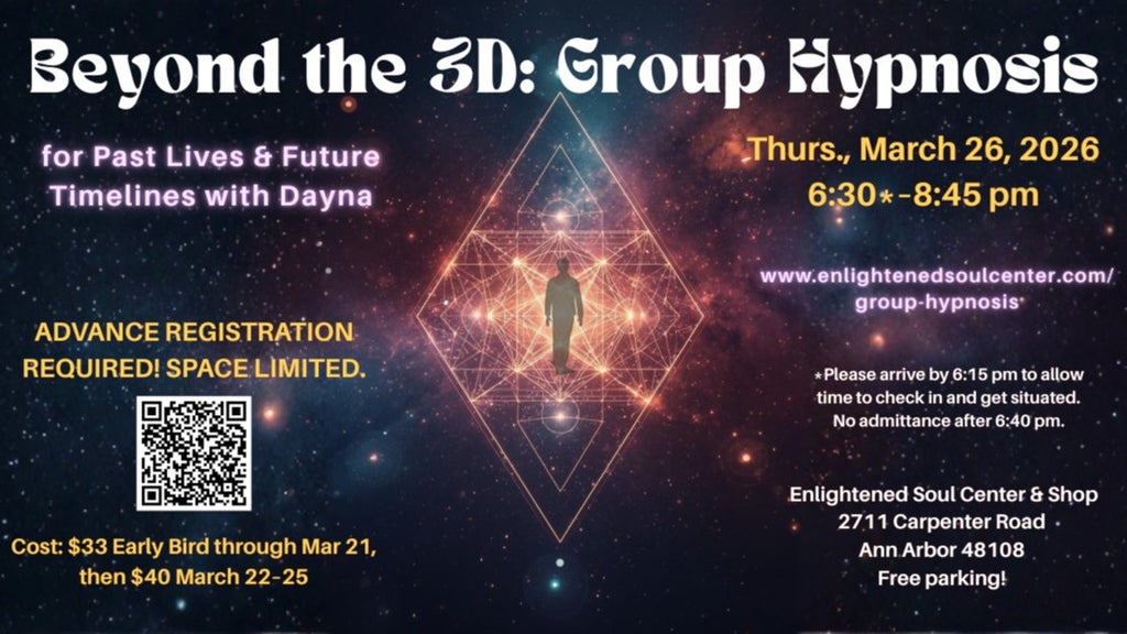 **Beyond the 3D: Group Hypnosis for Past Lives & Future Timelines with Dayna** Thursday, March 26, 2026 - 6:30*–8:45 pm ****Please arrive by 6:15 pm to allow time to check in and get situated. No admittance after 6:40 pm.*** ​​ ADVANCE REGISTRATION REQUIRED! SPACE LIMITED. ​ **Cost**: $33 Early Bird through March 21, then $40 […]