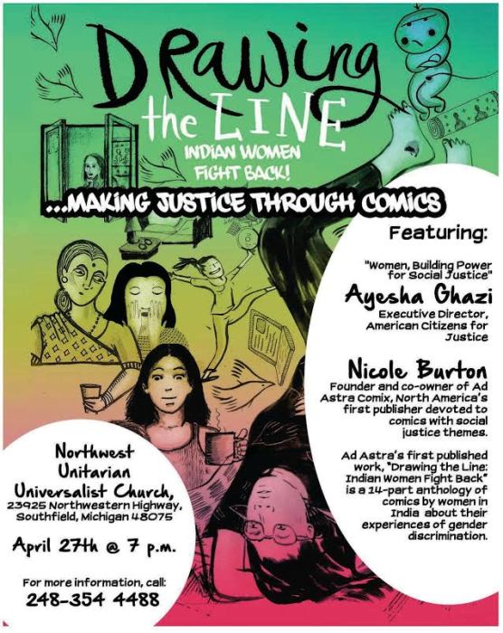 Southfield, MI. Southfield Sun. Wednesday, April 27 at 7:00 pm. Northwest Unitarian Universalist Church will sponsor an event called “Women Making Justice through Comics.” Featured speaker Nicole Burton, founder of Ad Astra Comix will share Drawing the Line, Indian Women Fight Back! a graphic (comic) representation of the unjust experiences of women in India. Also, Ayesha Ghazi, Executive Director of American Citizens for Justice will speak about Women Building Power for Social Justice. Join these compassionate women in an engaging discussion regarding diversity conquering adversity.